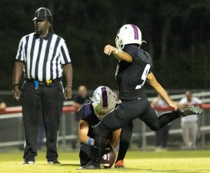 Forrest’s Isai Garcia boots a field goal to keep the Rockets within striking distance of the Indians. (Post Photo by Kacy Kincaid)